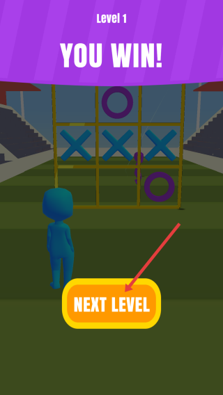 2、在3×3网格内,率先让X或O连成三子即获胜,Level1通关后点击NEXT LEVEL进入下一关。