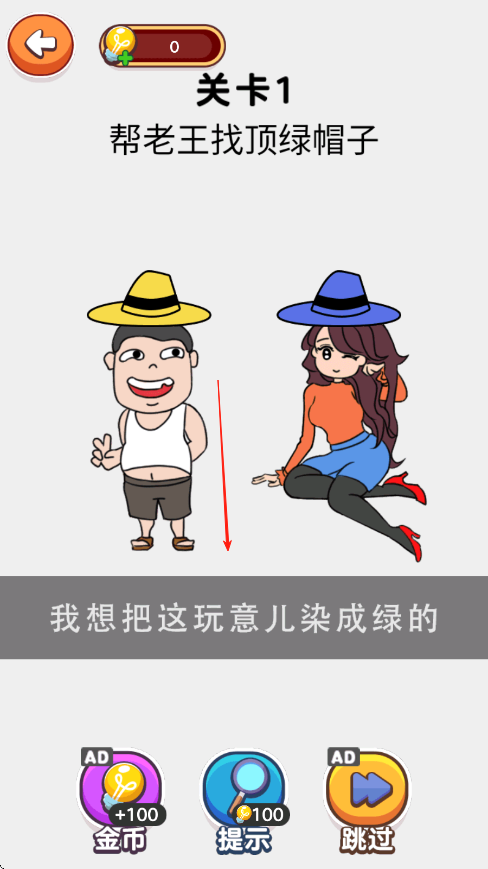 1、第一关我们需要拖动蓝色帽子或者黄色帽子,拖动到一起,则会变成绿色帽子,再将绿色帽子拖动到老王头上即可。