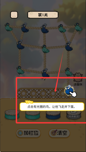 1、玩家需要仔细观察鸟窝颜色,点击对应颜色的发亮小鸟,让小鸟飞到正确位置下蛋脱颖而出。