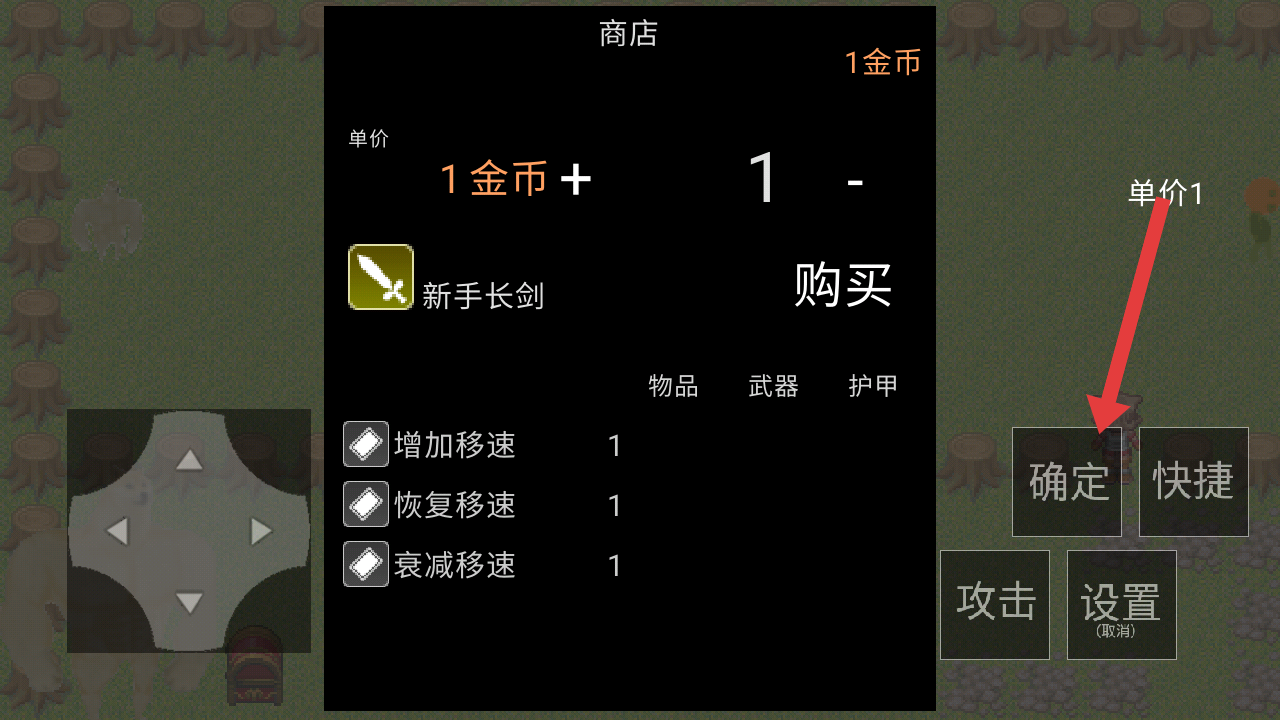 2、与NPC商人进行对话,进入商店的界面,选定新手长剑后点击确定,消耗角色的1金币完成购买。