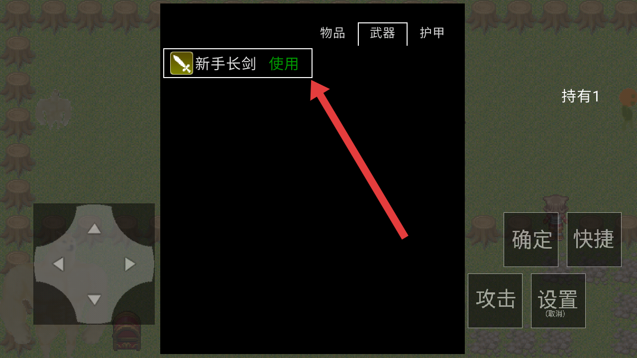 3、需要点击设置进入角色武器栏,点击新手长剑旁的使用,为自己的角色装备该武器提升战力。