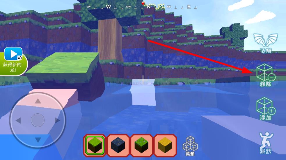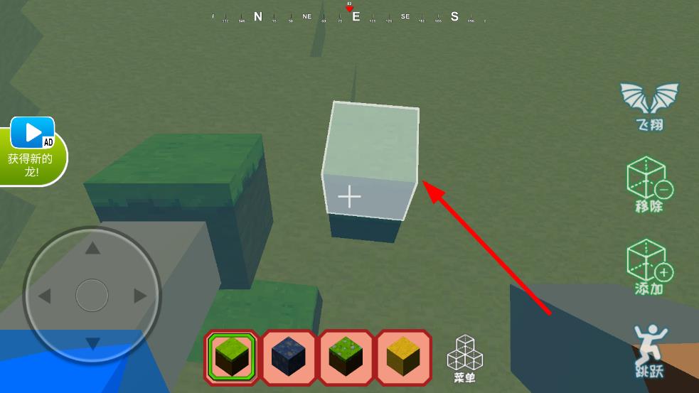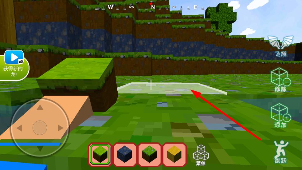 1、进入沙盒场景,点击右侧的添加或移除按钮,选中下方方块草地或泥土等,对将准心移动到目标区域后点击,即可放置、拆除方块,开始基础搭建。