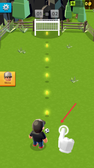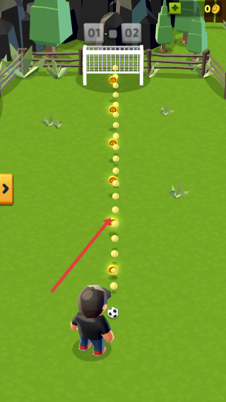 1、点击足球,沿黄色轨迹瞄准球门,轨迹含金币,踢球时兼顾进球与收集。