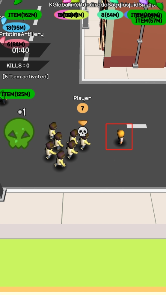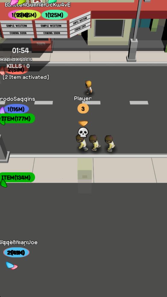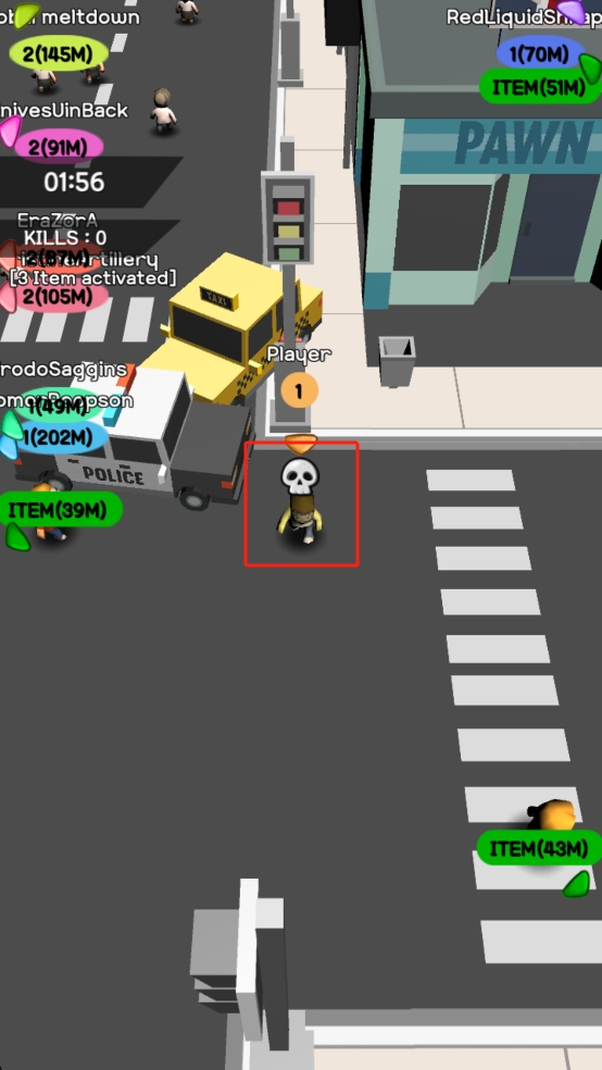 1、开局操控带骷髅头标识的角色,在城市街道移动,优先靠近绿色道具,收集后可提升能力,同时留意其他玩家动向。