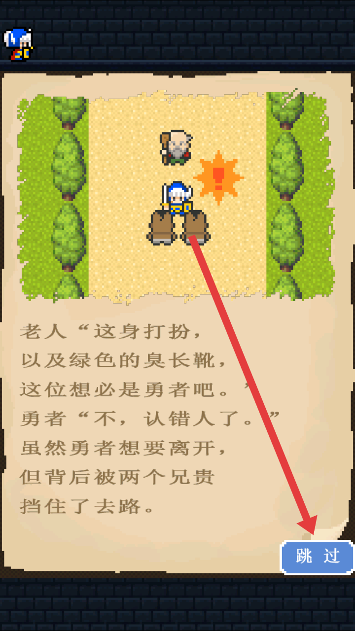 1、进入果然那家伙不做勇者了游戏,点击对话界面右下角跳过,可以快速的略过剧情描述。