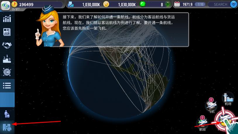 2、在地球仪界面,点击左侧“航班”相关按钮,按提示先购买飞机,了解航线开通流程。