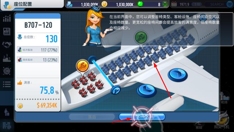 3、进入座位配置界面,调整座椅类型、间距等,点击“下一个”推进飞机配置,提升旅客满意度。