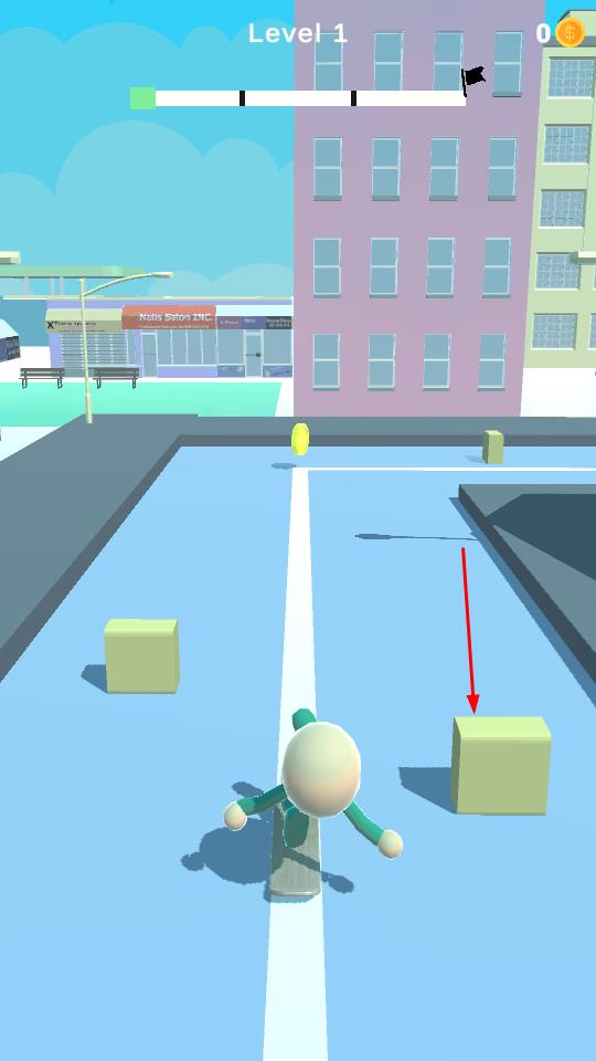 2、小人在滑行过程中,操控角色躲避方块障碍,留意道路金币,灵活调整滑行方向。