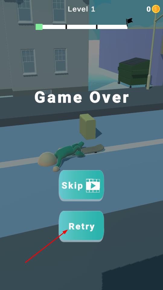 3、若挑战失败出现Game Over,点击Retry按钮重新开始,再次尝试通关 Level 1。