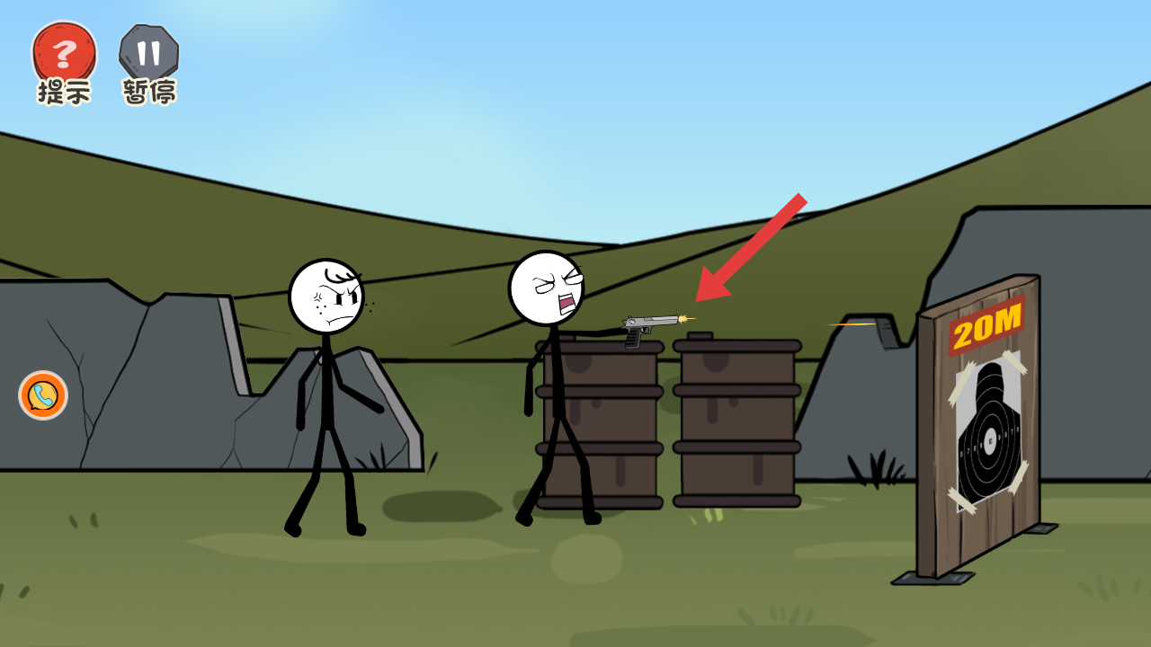 2、在射击的关卡中,点击火柴人拾取地上的手枪保卫自己和队友,不让对面的敌人靠近。