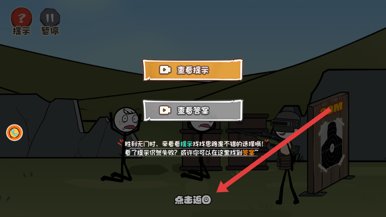 3、若挑战失败,点击界面下方点击返回,回到关卡起点重新尝试,可借助提示或答案功能辅助通关。