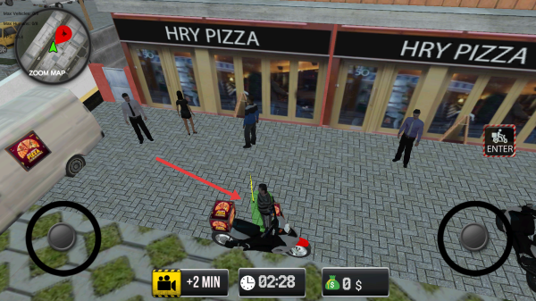 2、在街道场景,依据小地图和箭头指引,驾驶摩托前往HRY PIZZA店铺,留意时间和路人,安全行驶。