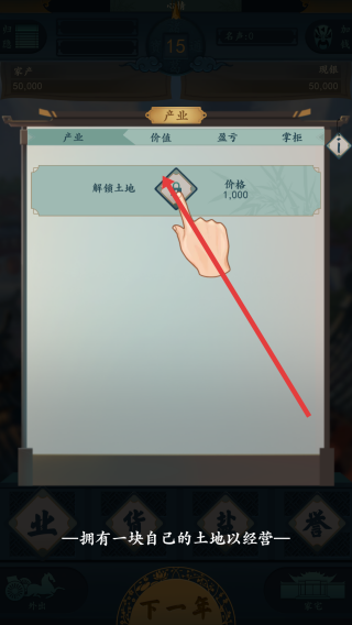 2、在产业界面,积累足够现银后,点击解锁土地花费1,000,拓展产业规模,为后续经营打基础。