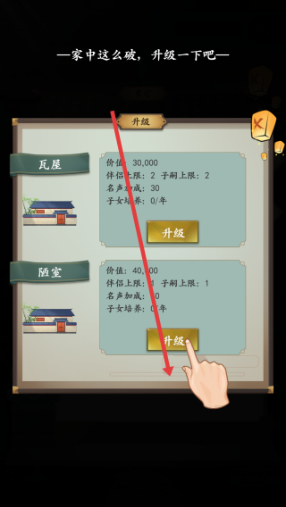 3、进入家宅升级界面,若资源充足,点击对应建筑如陋室的升级按钮,提升家宅价值与属性。
