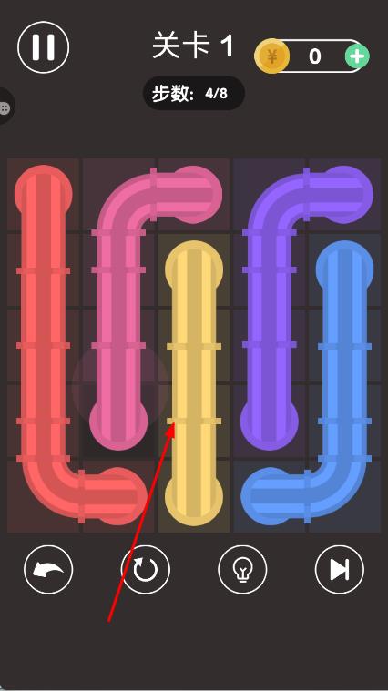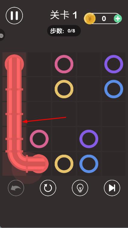 1、在关卡 1 界面,点击彩色圆环,移动至红色管道对应位置,进行拼接。