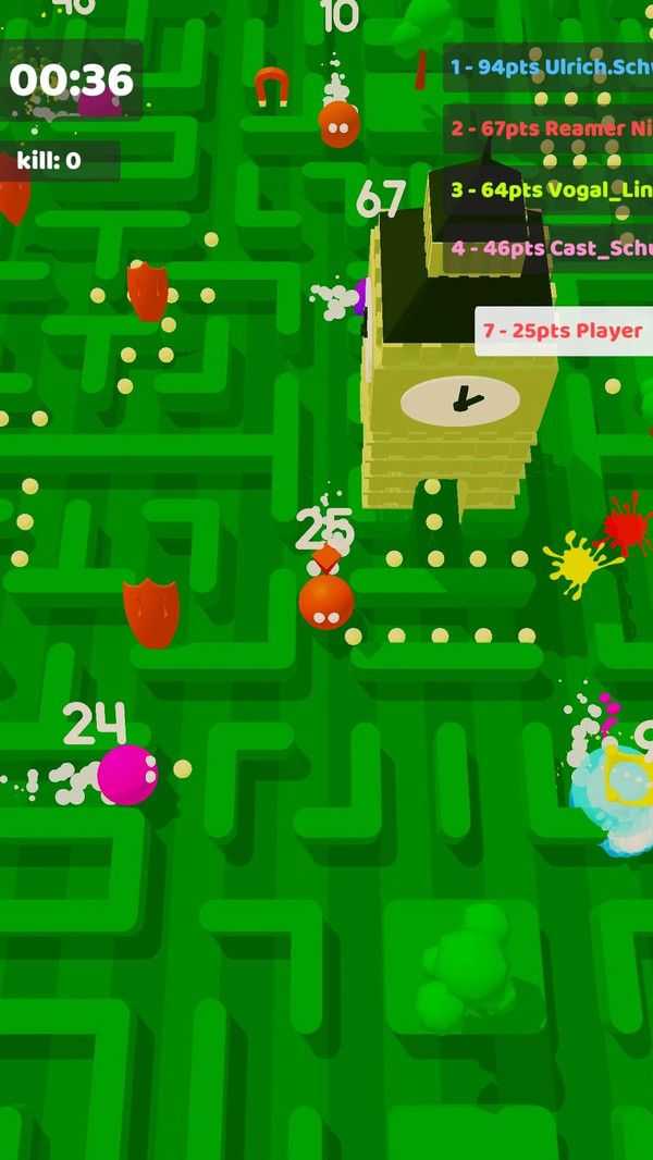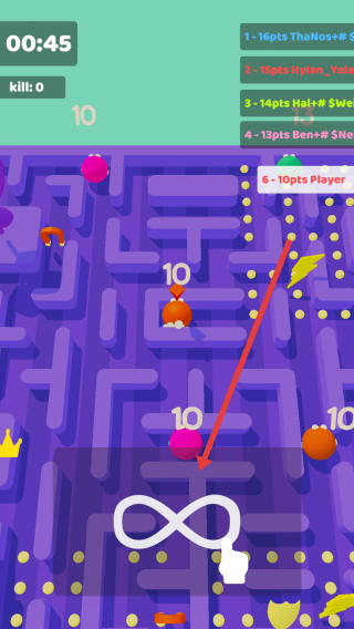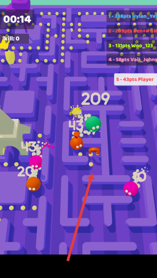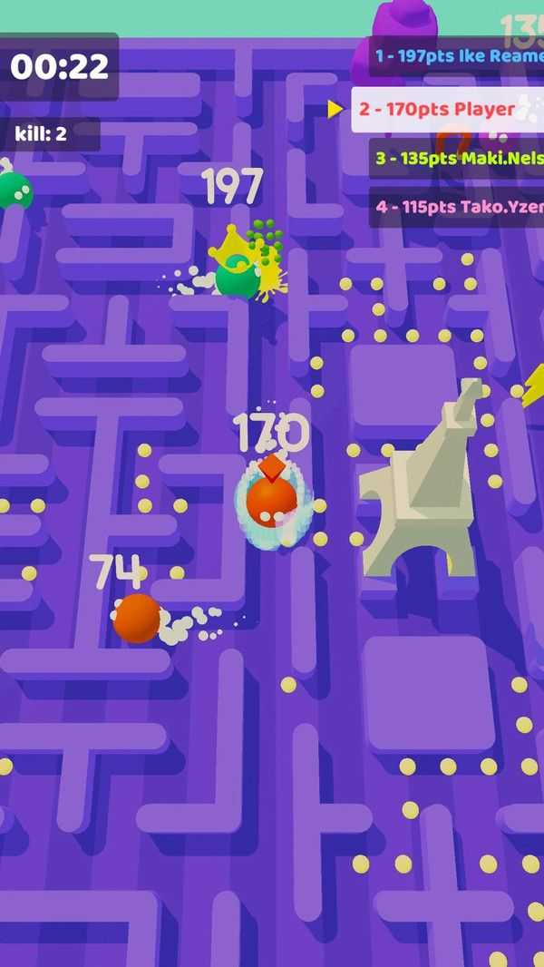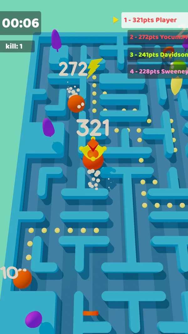2、在对战场景中,需要操控角色沿迷宫路径,收集黄色光点,同时避开其他玩家,积累积分。