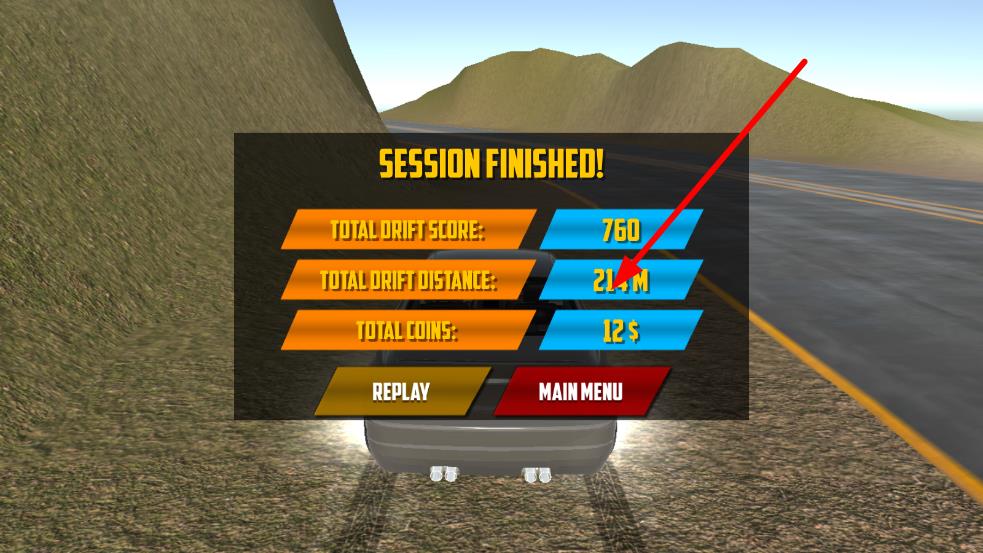 3、比赛结束后,查看漂移得分、距离、金币奖励,点击“REPLAY”重玩赛道,或“MAIN MENU”返回车库换车、挑战新赛道,积累资源。