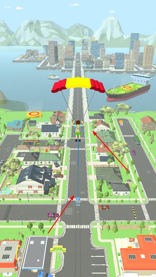 3、接近地面时parachute自动打开,控制角色精准落在目标圆环内,完成关卡挑战。