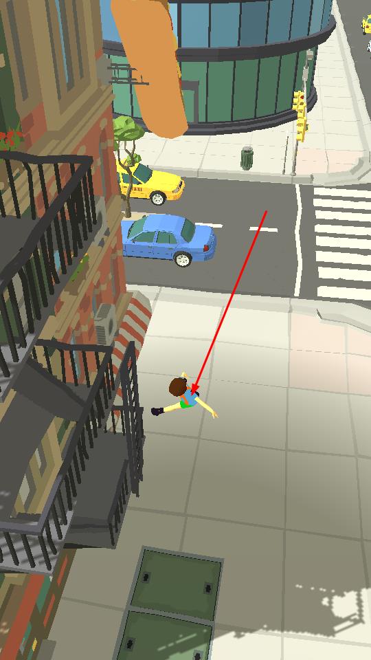 2、在城市场景中角色从高处跳下,按箭头指引操作移动,调整下落轨迹,朝着目标区域行进。