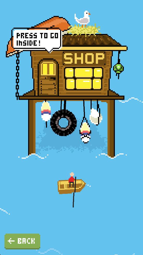 1、在初始界面点击黑色圆点即可进行移动,可先查看SHOP商店,购买渔具提升钓鱼成功率,再驾驶小船前往钓点。