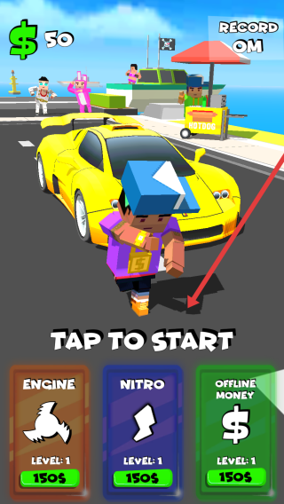 1、进入到游戏后,点击TAP-TO-START,开启汽车跑酷,可先升级ENGINE等属性,提升车辆性能。