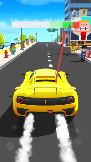 2、跑酷时操控汽车沿道路行驶,躲避行人与障碍,通过按照箭头指示,达到绿色时点击使人物快速飞出。