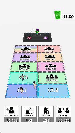 2、融合元素带动氛围:将不同音乐元素进行融合,操作DJ设备创造动感旋律,带动场景中的人物跟着节奏跳舞,通过互动提升氛围,推进关卡进度。