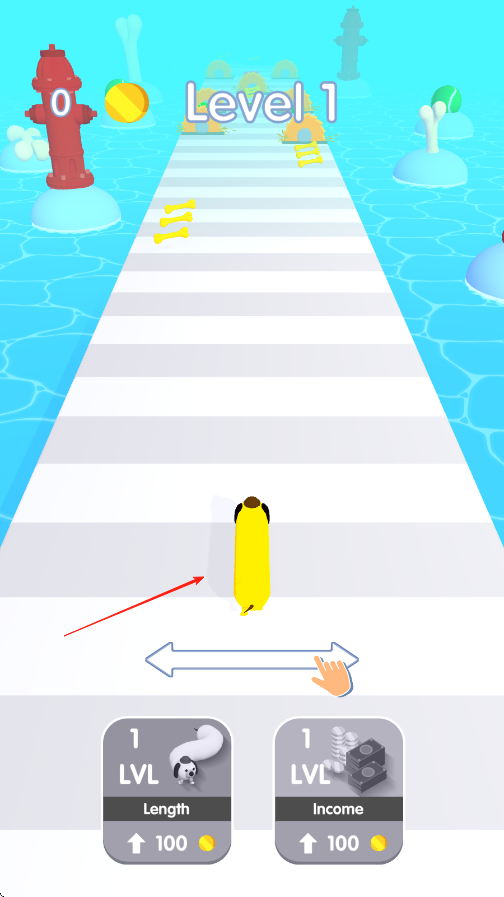1、进入游戏后,根据箭头提示,点击屏幕滑动即可操纵香肠狗向前移动,操纵香肠狗收集前方的骨头即可。