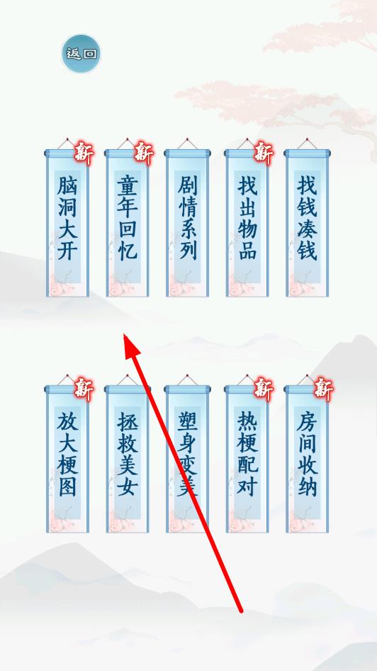 1、进入游戏,在关卡选择界面,点击如“童年回忆”“脑洞大开”等分类卷轴,进入对应主题关卡,开启热梗答题挑战,熟悉不同趣味题型。