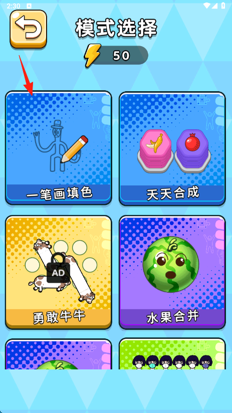 1、进入游戏,点击一笔画填色箭头指示方向,消耗闪电50进入玩法。