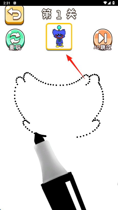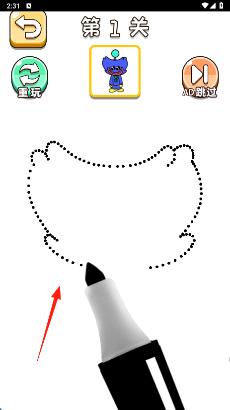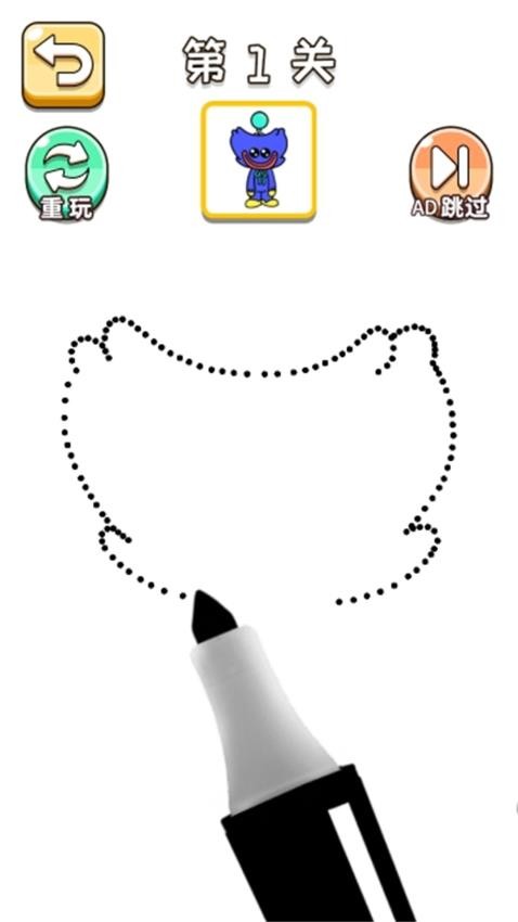 2、在第1关,按箭头指向起点,用画笔沿虚线绘制,一笔连通完成图案。