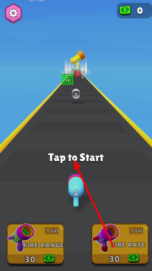 1、点击“Tap to Start”开启闯关,可消耗金币初始为0,升级下方“FIRE RANGE(射程)”“FIRE RATE(射速)”等枪械属性,为跑酷射击做准备。