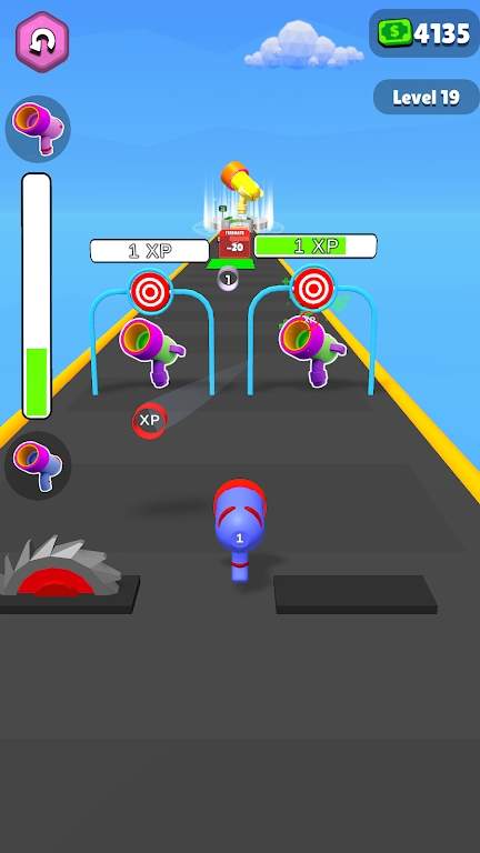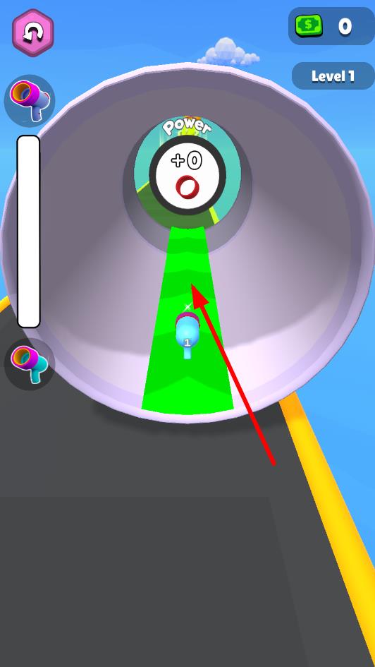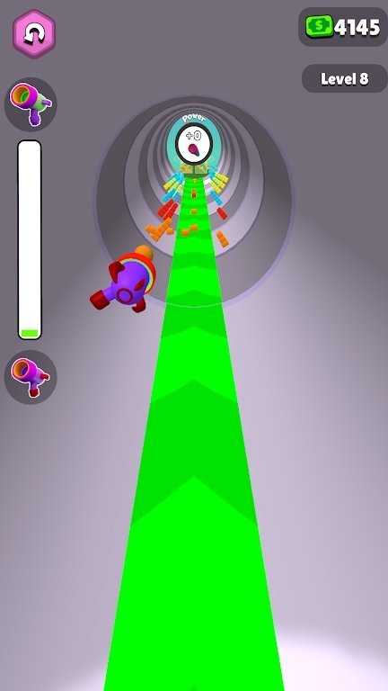 2、跑酷中操控角色沿道路前进,遇“Power”圆圈区域时,引导角色进入,借助其增益效果强化射击,瞄准绿色“1”“5”等障碍物射击击碎,注意躲避或击破特殊机关。