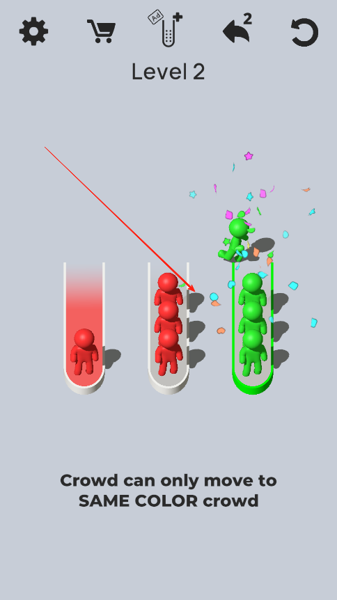 1、进入游戏后,选择初始关卡,观察试管中不同颜色小人的分布,熟悉点击试管移动小人的操作方式,尝试将第一个试管中的小人移至合适位置。