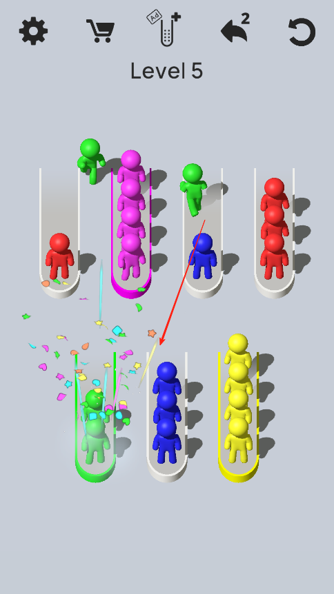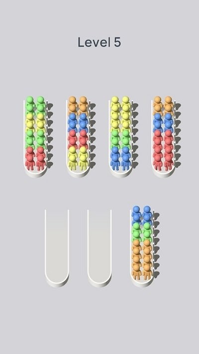 2、游戏进行中,根据试管容量和小人颜色,规划移动顺序,将同种颜色的小人逐步归到同一试管,遇到卡关时重新梳理排序逻辑,持续推进关卡。