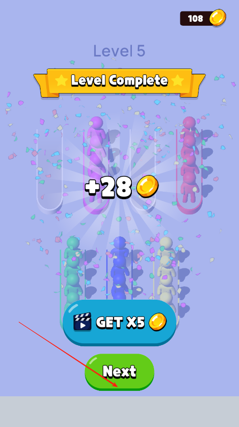 3、成功将所有试管中的小人按颜色分类排好后,系统判定关卡完成,发放通关奖励,解锁下一难度关卡,开启更复杂的排序挑战。