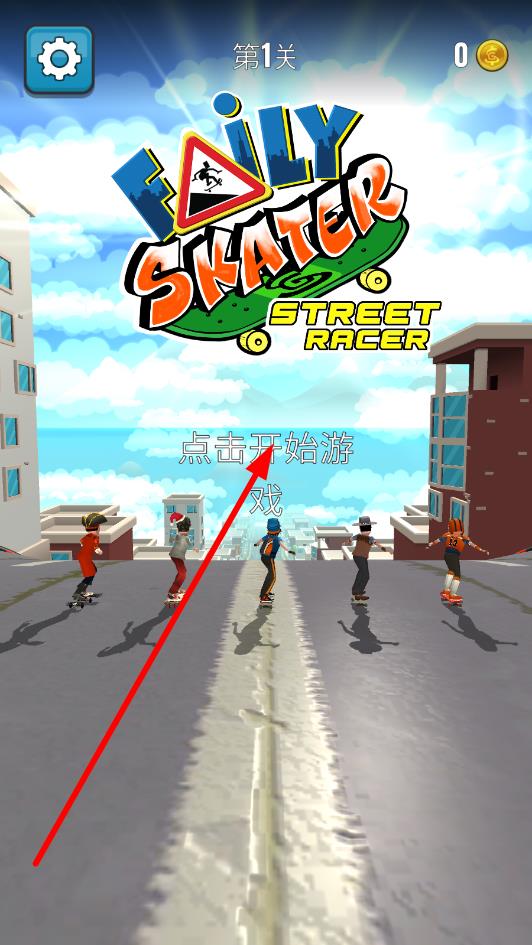 1、进在关卡选择界面第1关,点击“点击开始游戏”,操控菲尔踏上滑板,开启街头竞速挑战,熟悉基础滑板启动与场景进入流程。