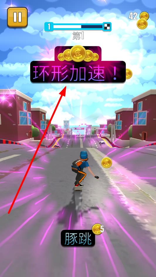 2、竞速中通过点击、滑动屏幕,让菲尔执行“豚跳”“环形加速”等动作,躲避障碍、收集沿途金币与道具,利用道具提升速度、解锁临时技能。