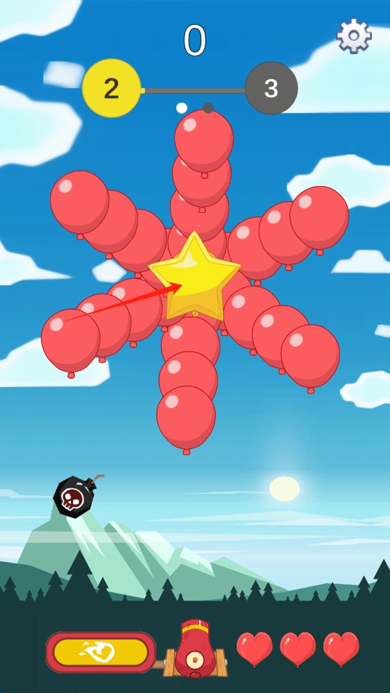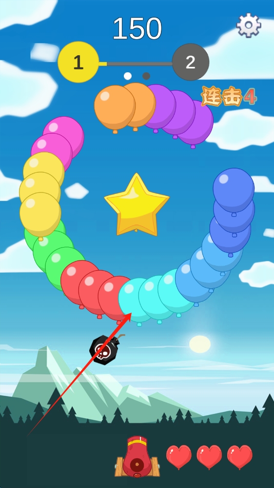 1、游戏中,瞄准彩色气球发射炮弹,优先击破连串气球,触发连击,收集星星,点击戳气球。