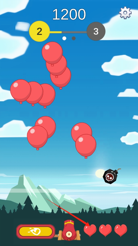 3、注意躲避炸弹,保护炮台爱心血量,持续击破气球,推进至下一关卡,点击查看血条。