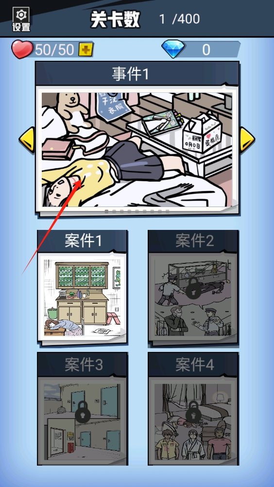 2、在关卡选择页,点击事件1 - 案件1,进入首个案件解谜场景,点击选择游戏关卡。