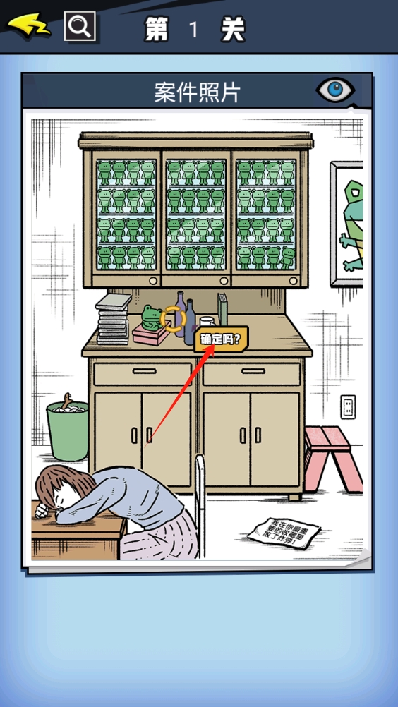 3、案件场景中,点击确定吗?等线索标识,收集信息,推理破解案件,点击选择谜题关键。