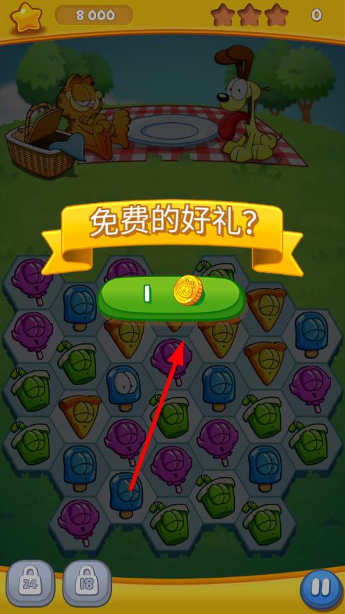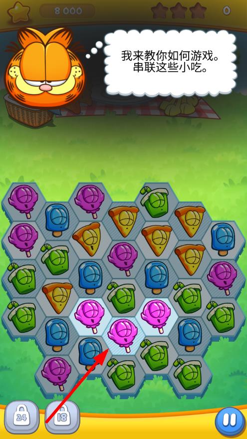 1、进入游戏,在初始关卡中熟悉加菲猫主题的方块样式,尝试交换相邻方块,完成首次消除组合,了解基础得分规则。