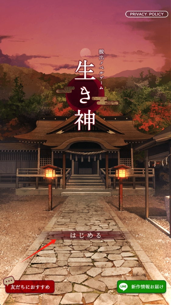 1、在脱出ゲーム-生き神启动界面,点击はじめる,开启神社背景的逃脱冒险,点击开始游戏。