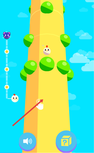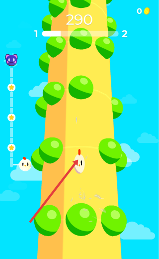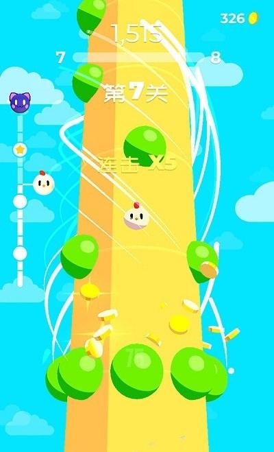 1、用户点击屏幕操控小鸡跳跃,精准落在绿色球球上,借助弹跳力向上跳,注意落点的时机。