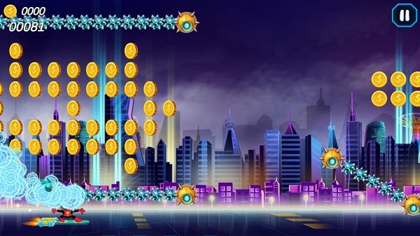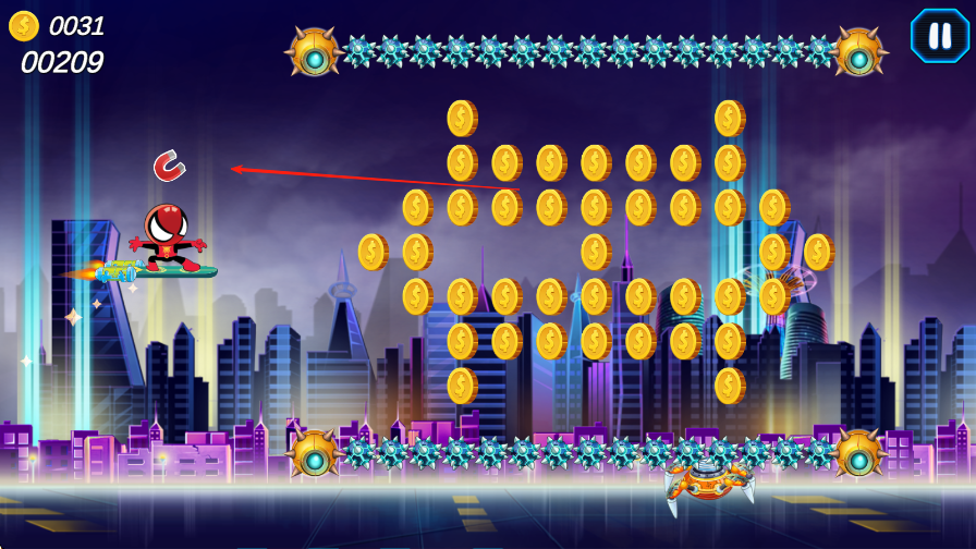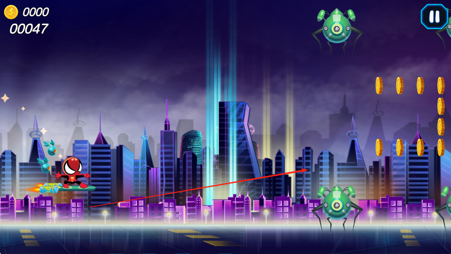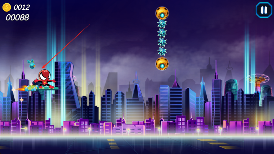 2、操控滑板在关卡中穿梭,躲避障碍物、跳跃过沟坎,同时收集金币,蜘蛛侠后方有两个小球,相当于血量次数,一局可以失误三次。