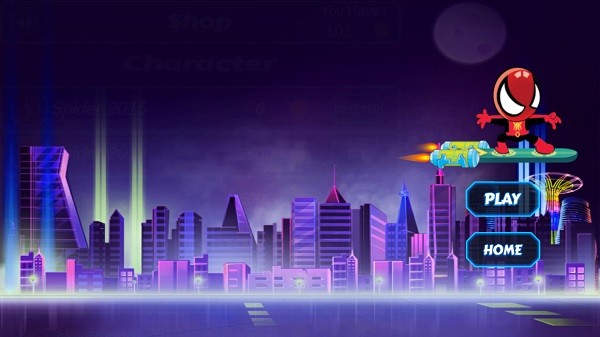 1、进入游戏后,选择初始蜘蛛侠套装和滑板,点击屏幕,滑板会往上冲刺,要注意避开前面的怪物。