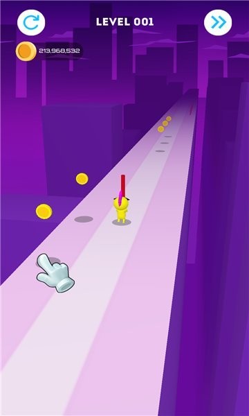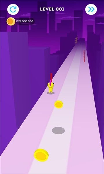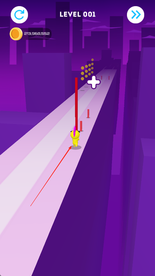1、移动小黄人收集地上的红色杆子,一边收集杆子一边收集金币,杆子到最后会撑在半空中到达终点。