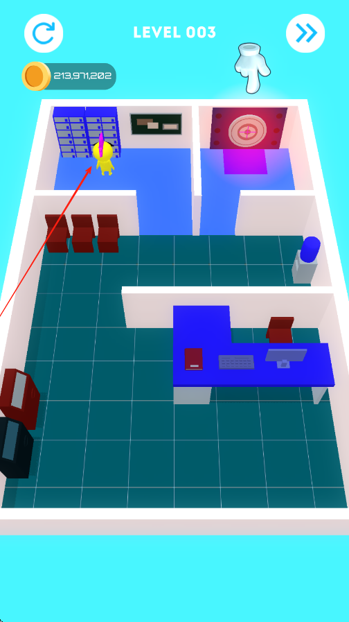 2、进入房间寻找到角落的钥匙,带着钥匙找到箭头所指的保险箱位置,打开保险柜的第一道锁。