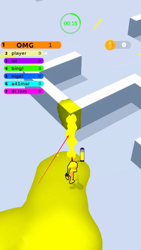 2、游戏进行中,在竞技场中灵活移动,瞄准其他画家射击以改变其颜色,同时利用射击改变环境颜色来占据优势,注意躲避对手的攻击,不断扩大自己的涂色范围。